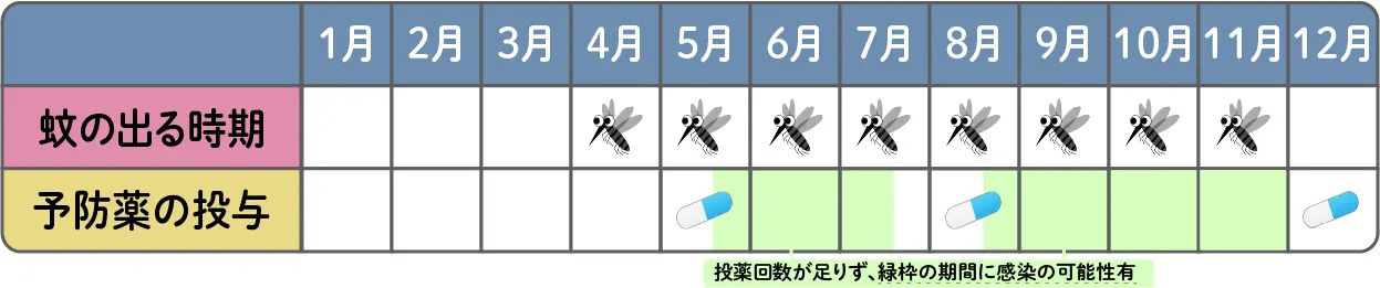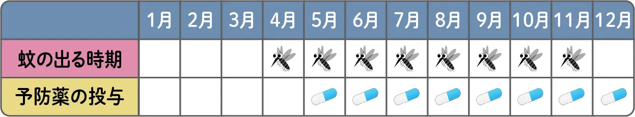 投与期間は蚊が出始めて1か月後から投与を始めて、蚊がいなくなった1か月後にシーズン最後の投与を行うのが基本です。